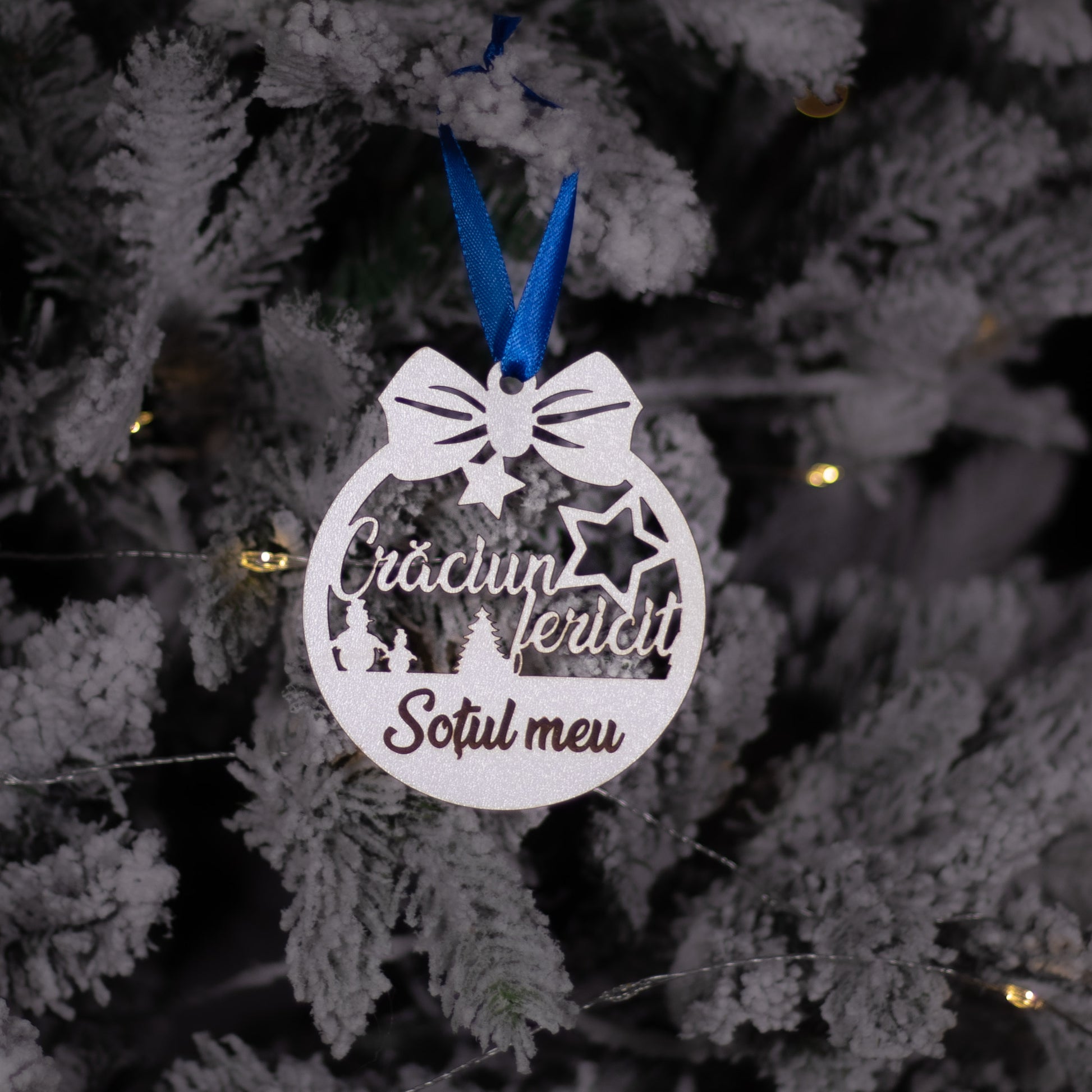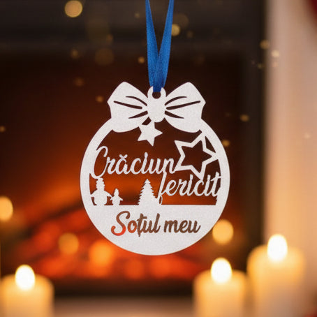 Transformă bradul de Crăciun într-un simbol al iubirii cu globulețul din lemn „Soțul meu”, un ornament care exprimă afecțiune, apreciere și legătura voastră specială. Gravura atent realizată pe lemn natural conferă un aspect elegant și autentic, perfect pentru sărbători pline de căldură și emoție.