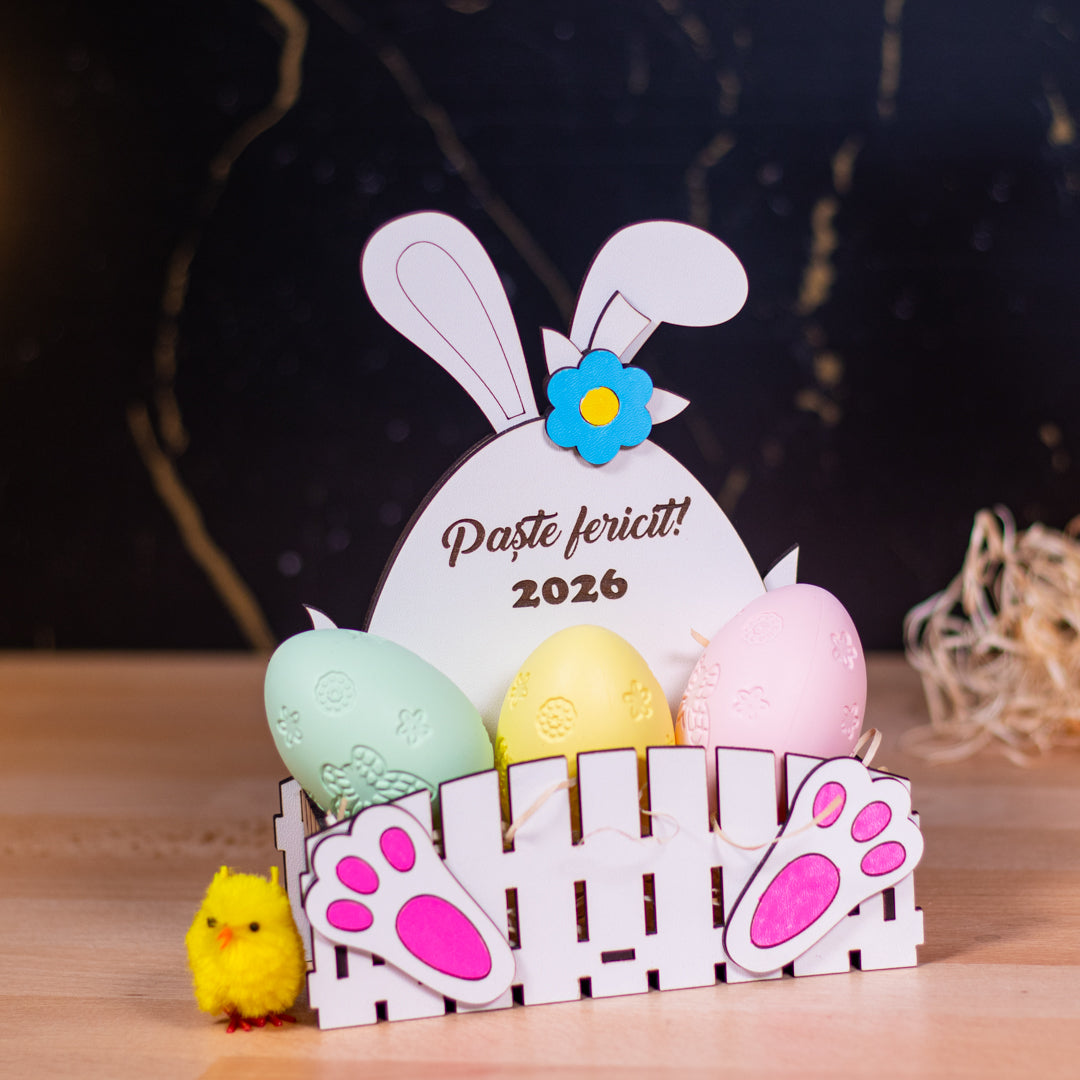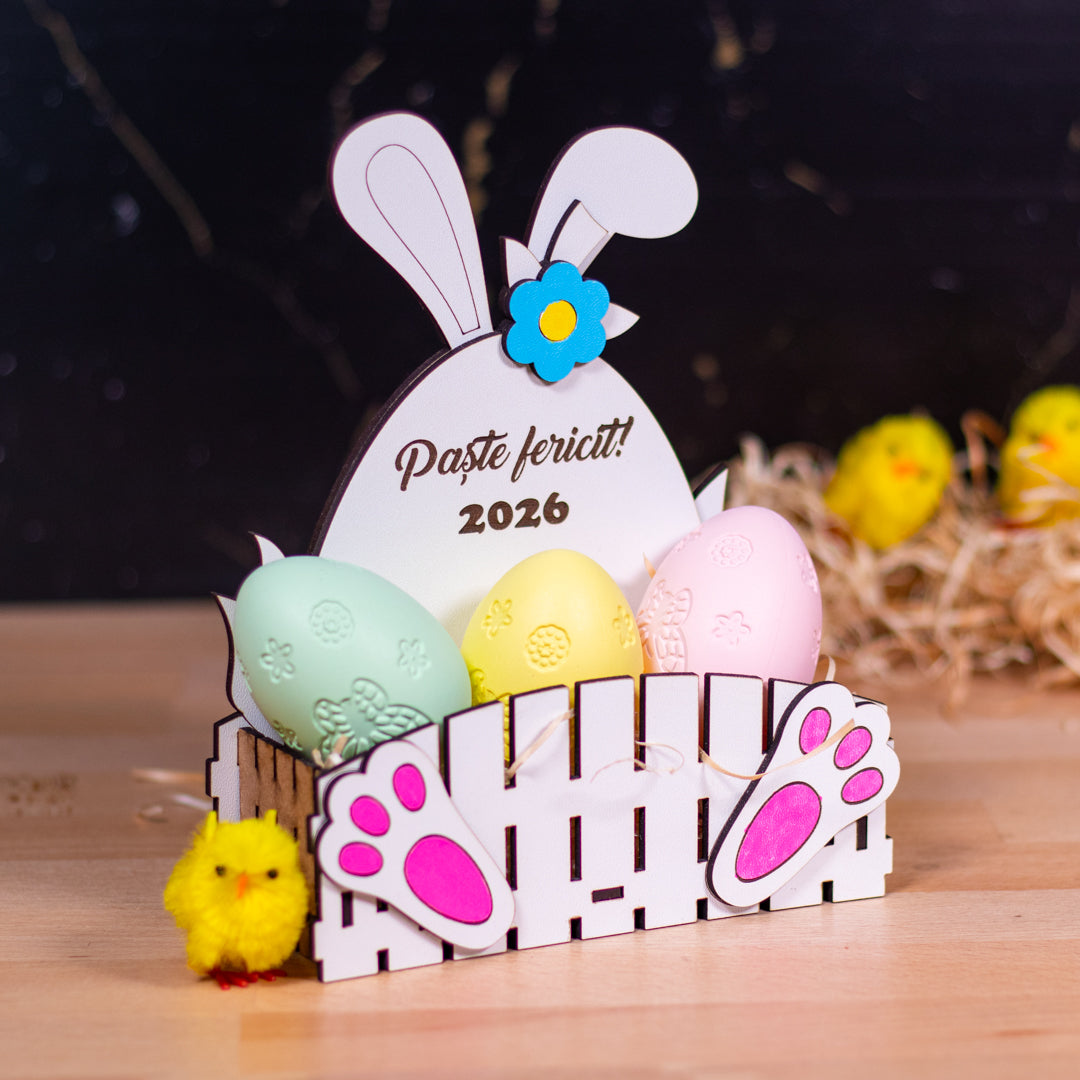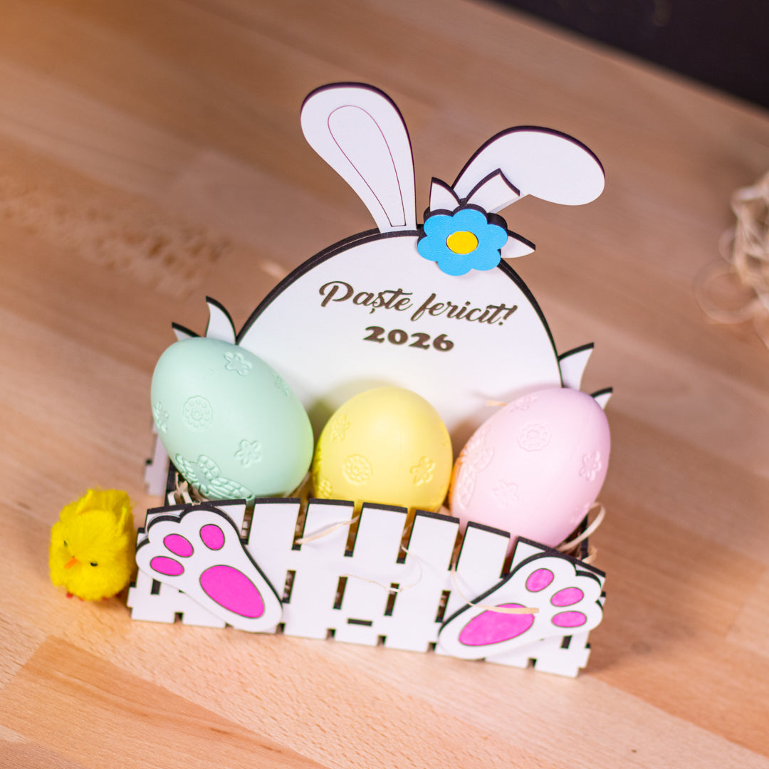 ✔️ Decor: Iepuraș simpatic și mesaj „Paște Fericit 2026” realizate cu precizie