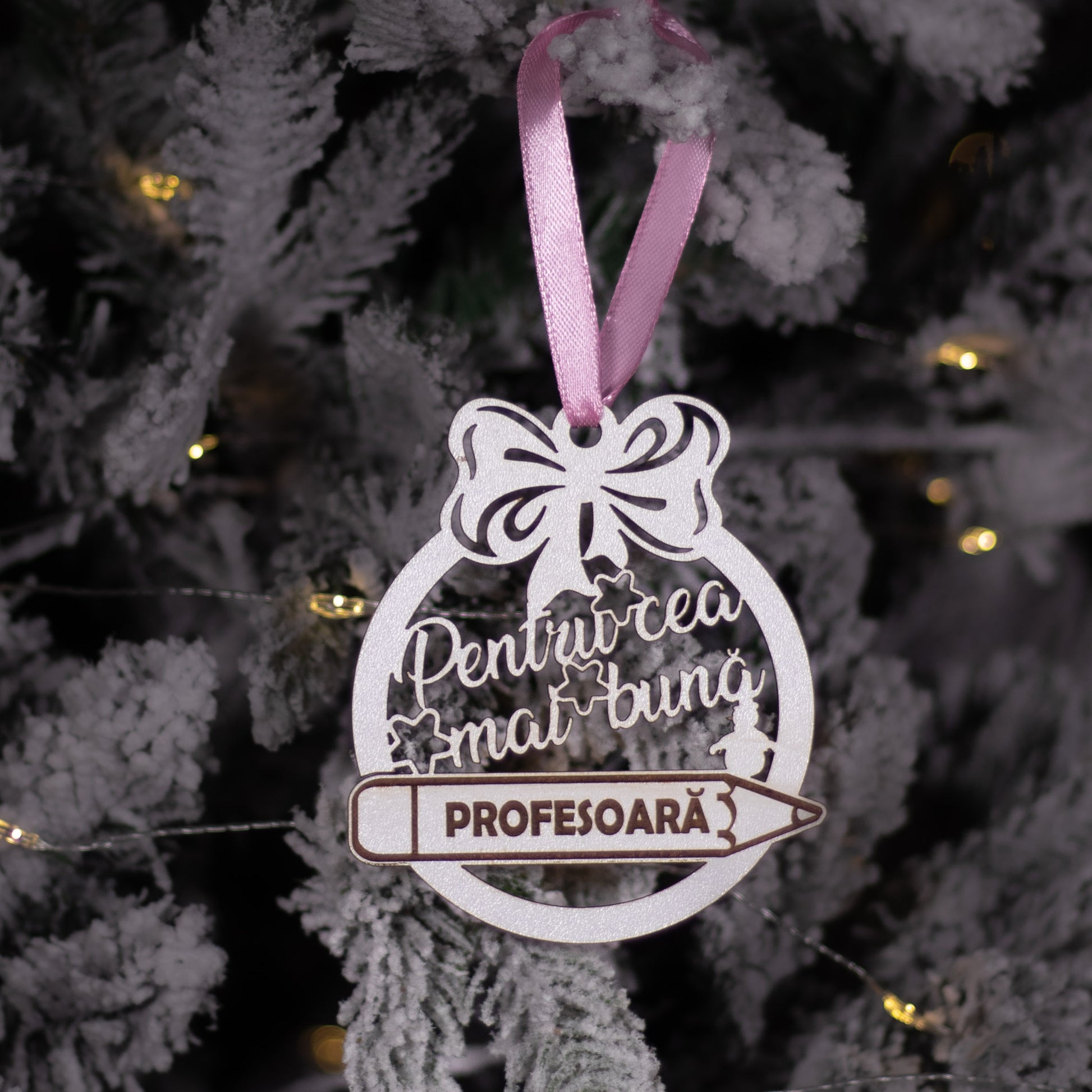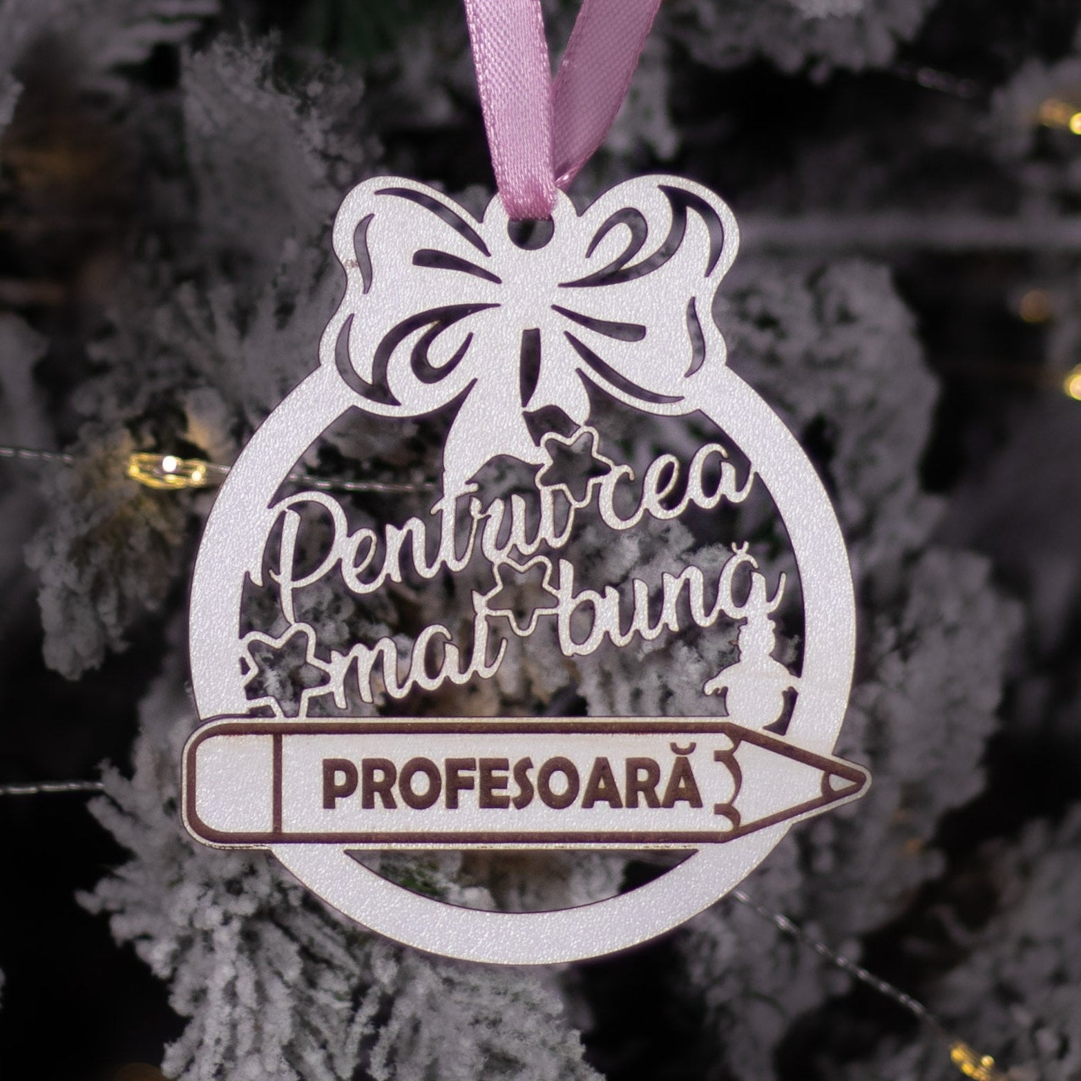 Exprimă aprecierea și recunoștința în acest Crăciun cu globulețul din lemn „Pentru cea mai bună profesoară”, un ornament elegant și personalizat care transmite respect și mulțumire pentru dedicarea și răbdarea sa. Gravura delicată și lemnul natural îi oferă un aspect autentic și rafinat, ideal pentru bradul de Crăciun.
