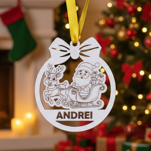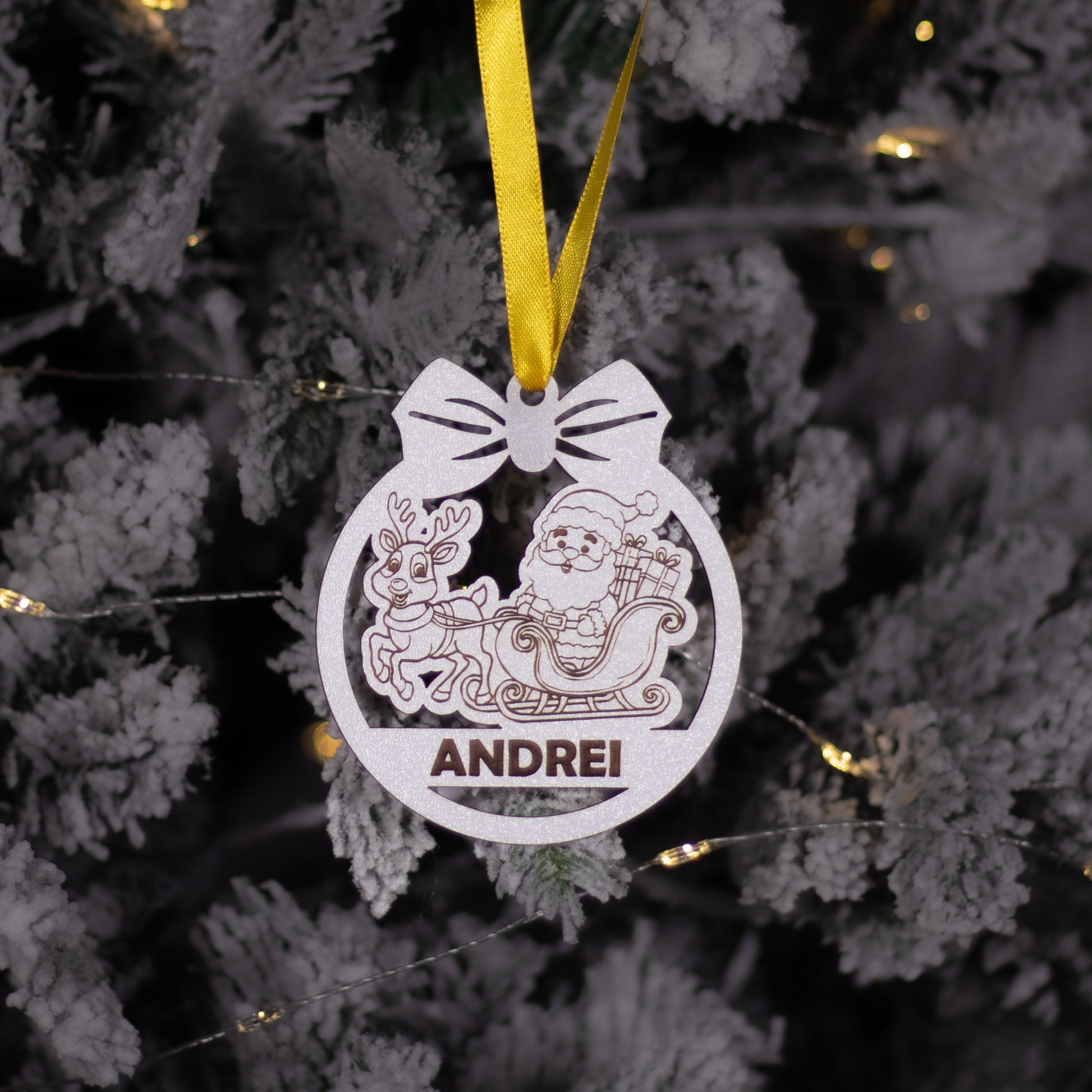 ✔️ Design: Moș Crăciun în sanie, cu nume gravat, panglică roșie