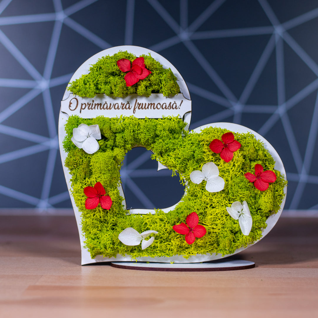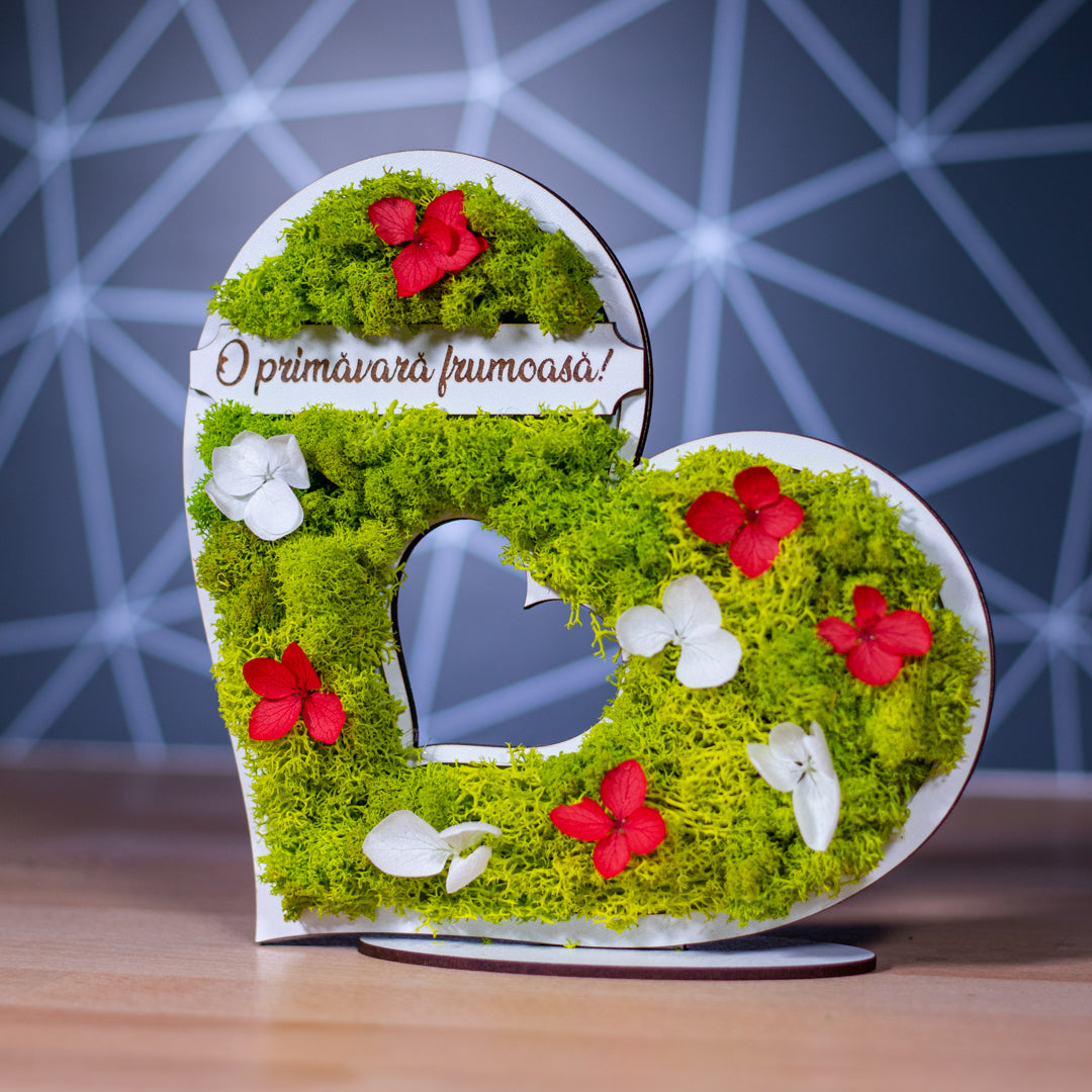 🌿💖 Plachetă decorativă – „O Primăvară Frumoasă”, formă inimă, cu licheni și hortensii 💚✨ Surprinde primăvara cu un cadou delicat și natural! Această plachetă handmade combină licheni stabilizați și flori de hortensie, gravată cu mesajul „O Primăvară Frumoasă”. Ideală pentru a aduce prospețime și culoare în casa sau biroul celor dragi.